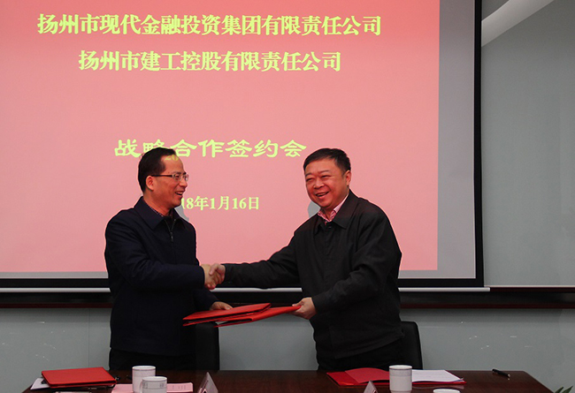 1月16日下午,揚(yáng)州建工控股有限責(zé)任公司與揚(yáng)州市現(xiàn)代金融投資集團(tuán)有限責(zé)任公司(下稱“金融集團(tuán)”)舉行戰(zhàn)略合作簽約會。公司董事長王宏、副總經(jīng)理程杰,金融集團(tuán)董事長龔振志、總經(jīng)理劉研等出席簽約會。