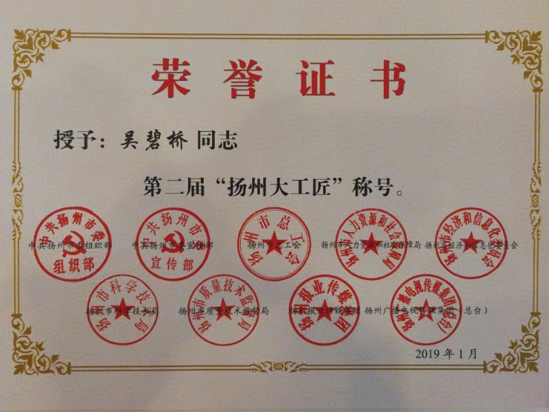 公司總工吳碧橋同志榮膺第二屆“揚(yáng)州大工匠”稱號