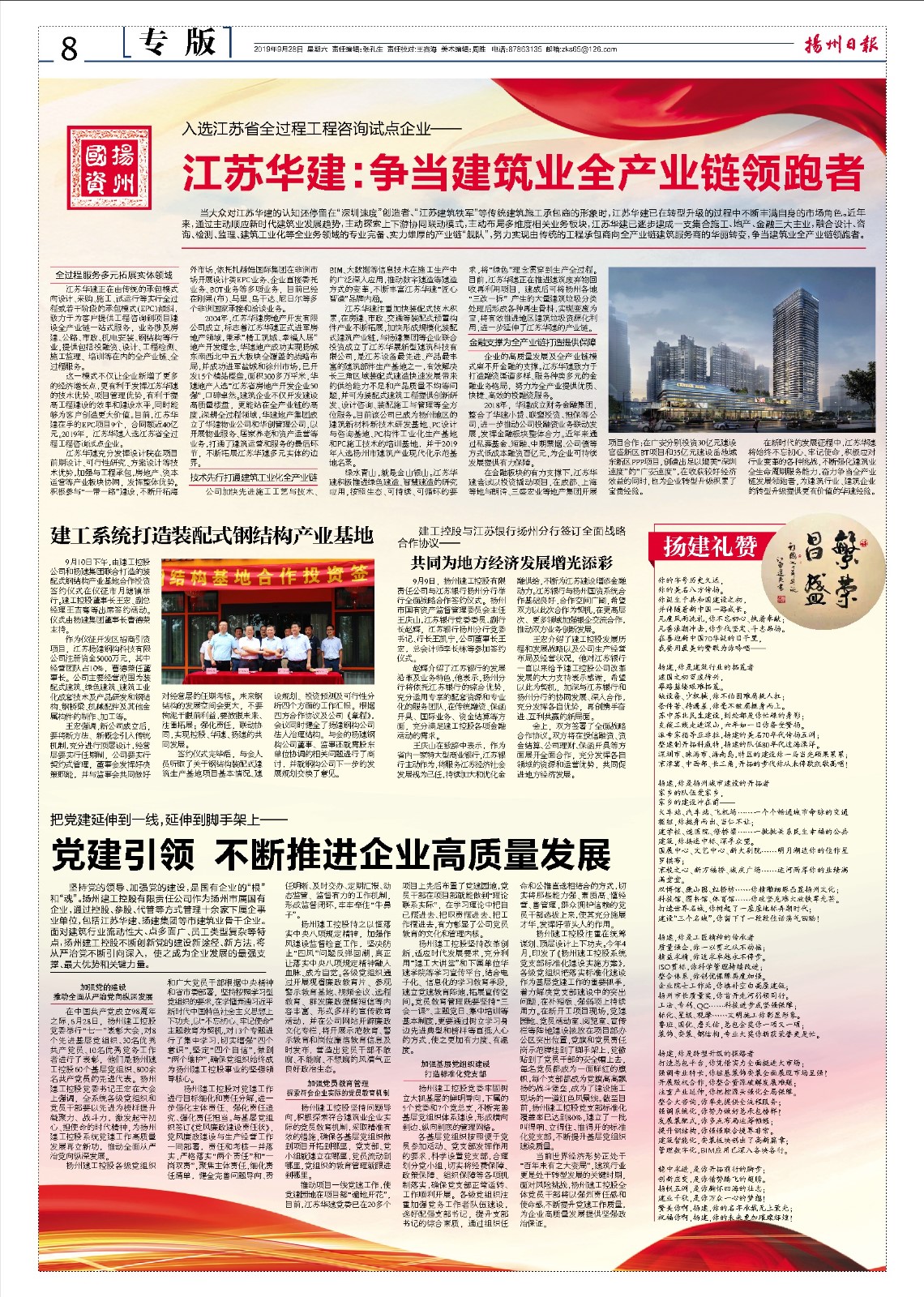 為了充分展示新中國成立70年來特別是黨的十八大以來建工控股改革發展所取得的歷史性成就,公司推出一期《揚州日報》國慶專版,并對公司網站進行了全面改版,更加符合當下信息宣傳需要。系統企業江蘇華建、揚建集團參加由市政府舉辦的2019運河文化嘉年華活動,用精心裝飾的花船點亮了千年運河的獨特風姿。江蘇華建同時聯合揚州廣電推出了慶祝新中國成立70周年特別策劃——《愿以此身長報國》,展現了一個地方國企的初心和擔當。